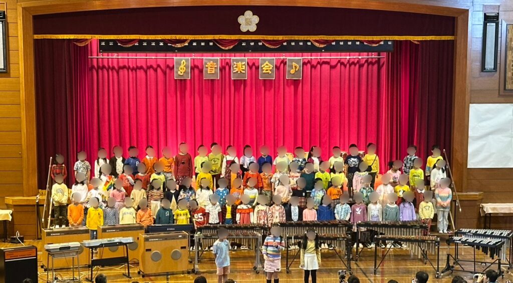 友達と声を合わせる楽しさが伝わる元気な歌声で始まりました。鍵盤ハーモニカの揃った音色や、合奏「南の国のハメハメハ大王」での南国らしい衣装とダンスを交えた発表は、リズムに合わせて楽しそうに動く子供たちの姿が微笑ましく、会場が明るい雰囲気になりました。