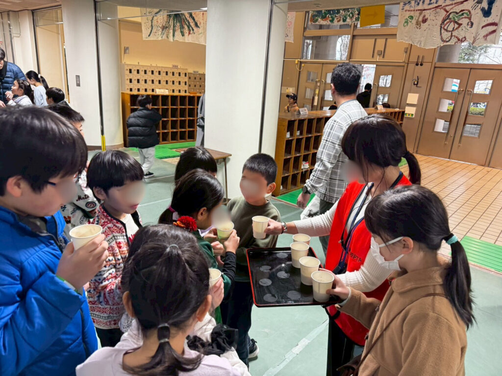 つきたてのお餅で作ったお汁粉は、どの学年の児童からも「おいしい!」という声があがり、自然と会話も弾み、学年を越えた交流の場となりました。