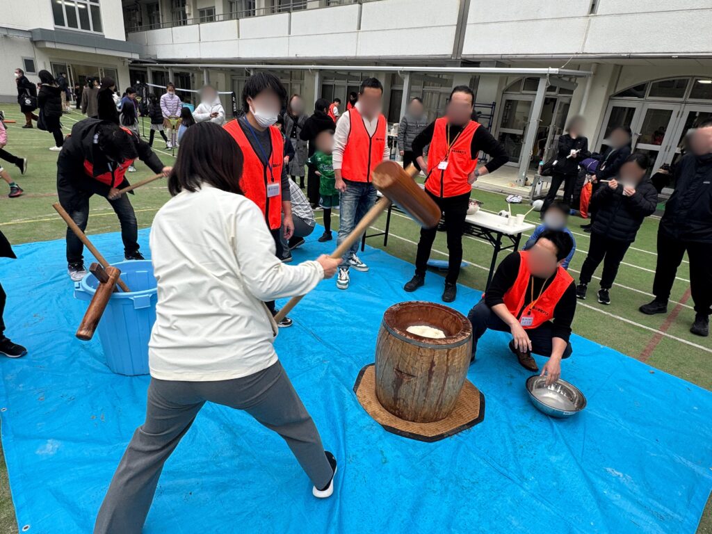 また、先生方も一緒に参加され、子どもたちと声を掛け合いながら餅つきを行う場面も見られました。