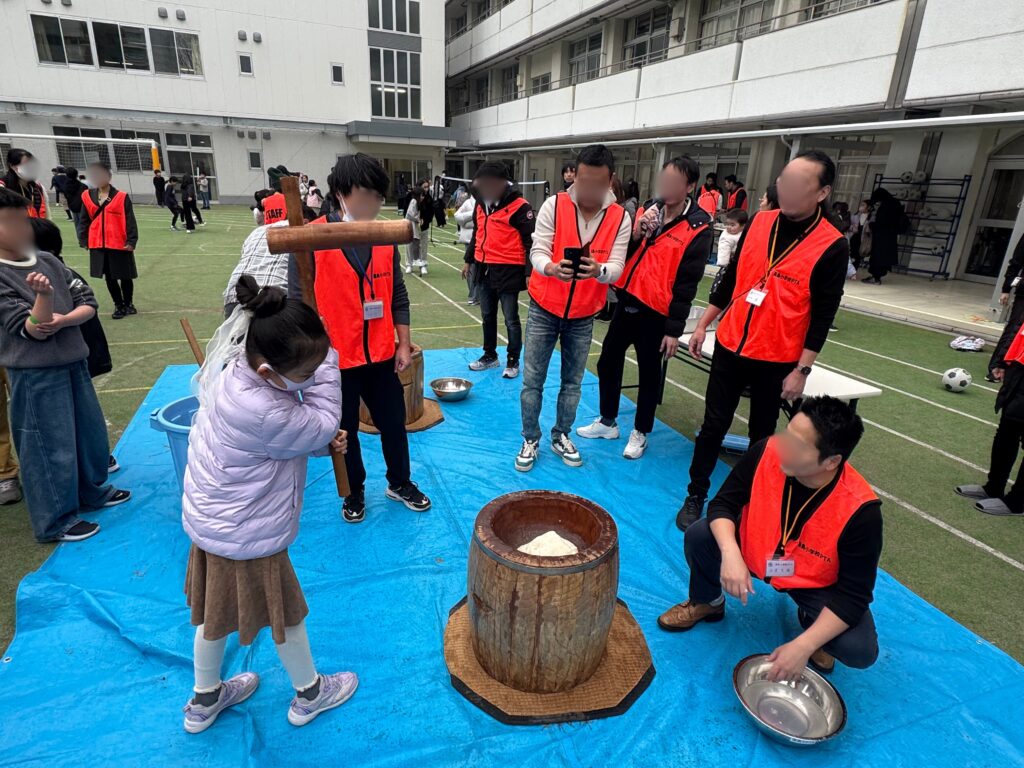 初めて杵を持つ児童も多く、少し緊張した様子も見られましたが、次第に笑顔が増え、父親クラブや先生方に見守られながら、楽しそうに取り組む姿がとても印象的でした。